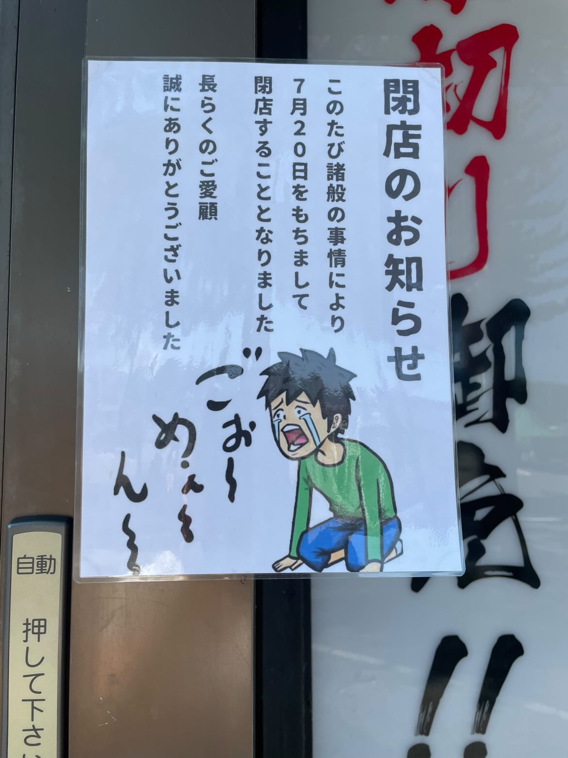 厚切りチャーシューが自慢の昔ながらの中華そばが非常に美味しく、何度も通った大好きなラーメン屋でしたが、残念ながら2025年7月20日(日)をもって突然の閉店。。