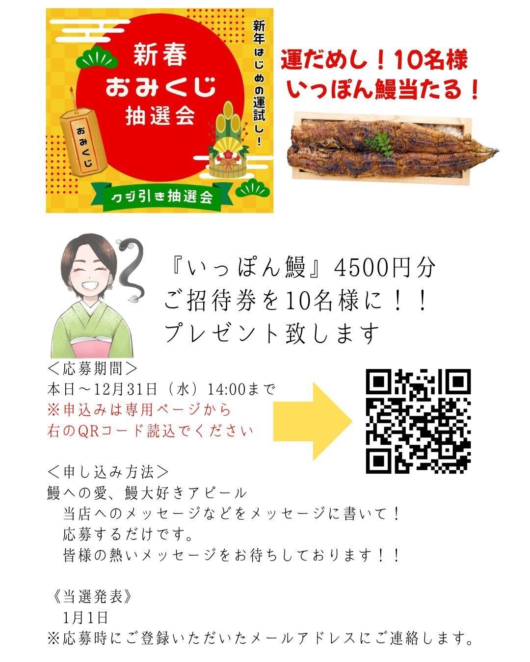 ✨「いっぽん鰻(4,500円分)」のご招待券が当たる新春おみくじ抽選会✨が開催されるそうです!