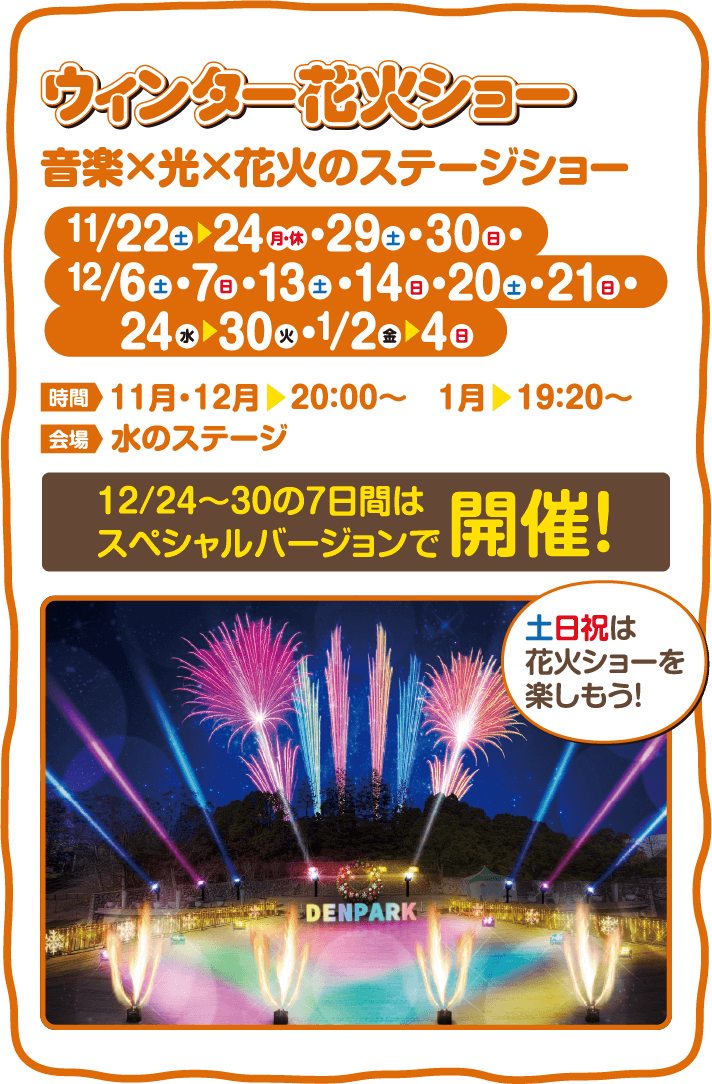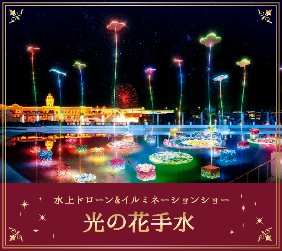 2025年11月2日〜(冬期イベントは2026年春まで続くスケジュールあり)。詳しいショー日程や花火の開催日は公式HPで要チェック。