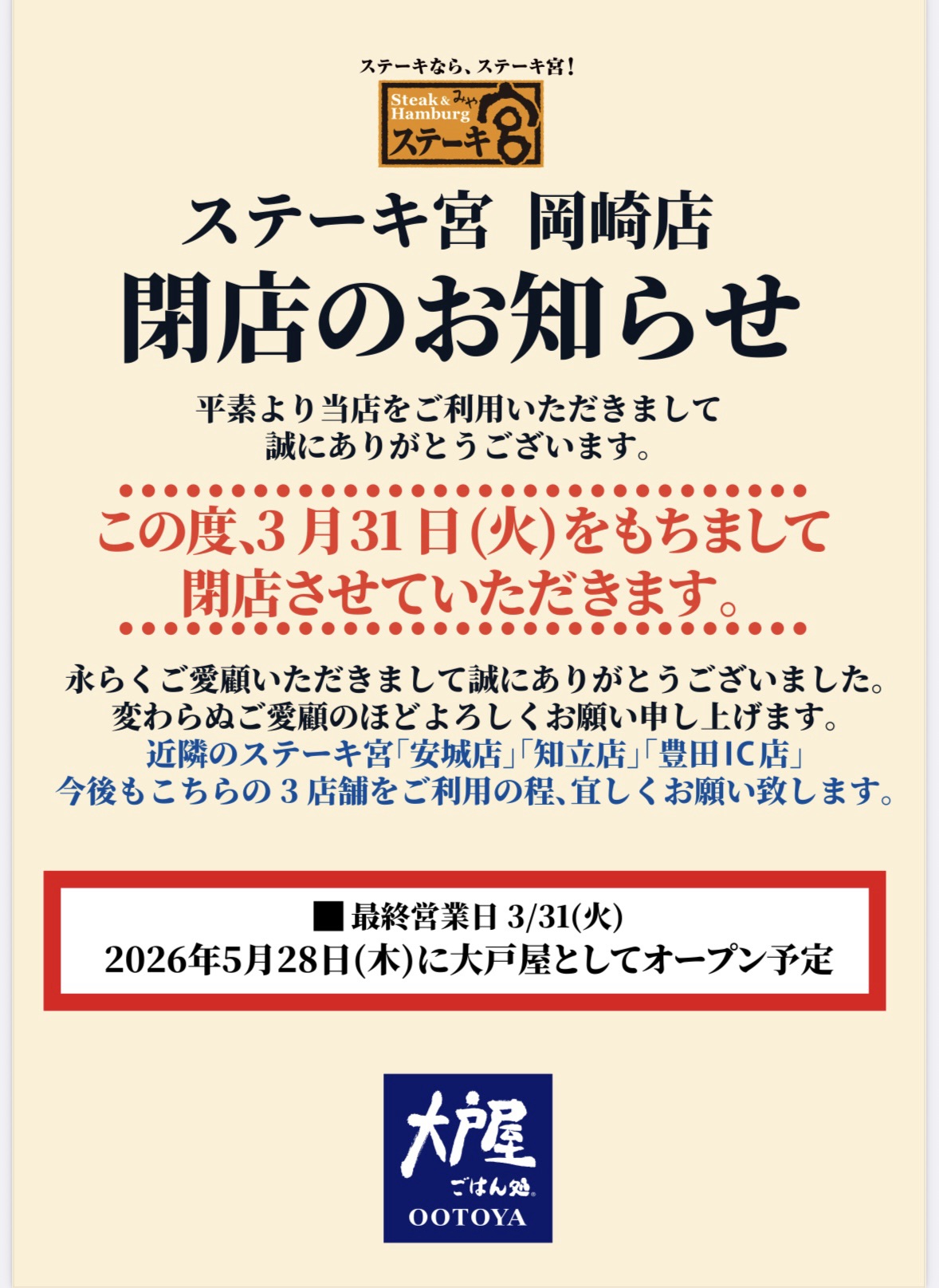 長年親しまれてきた「ステーキ宮 岡崎店」が、2026年3月31日をもって閉店することが発表されました。