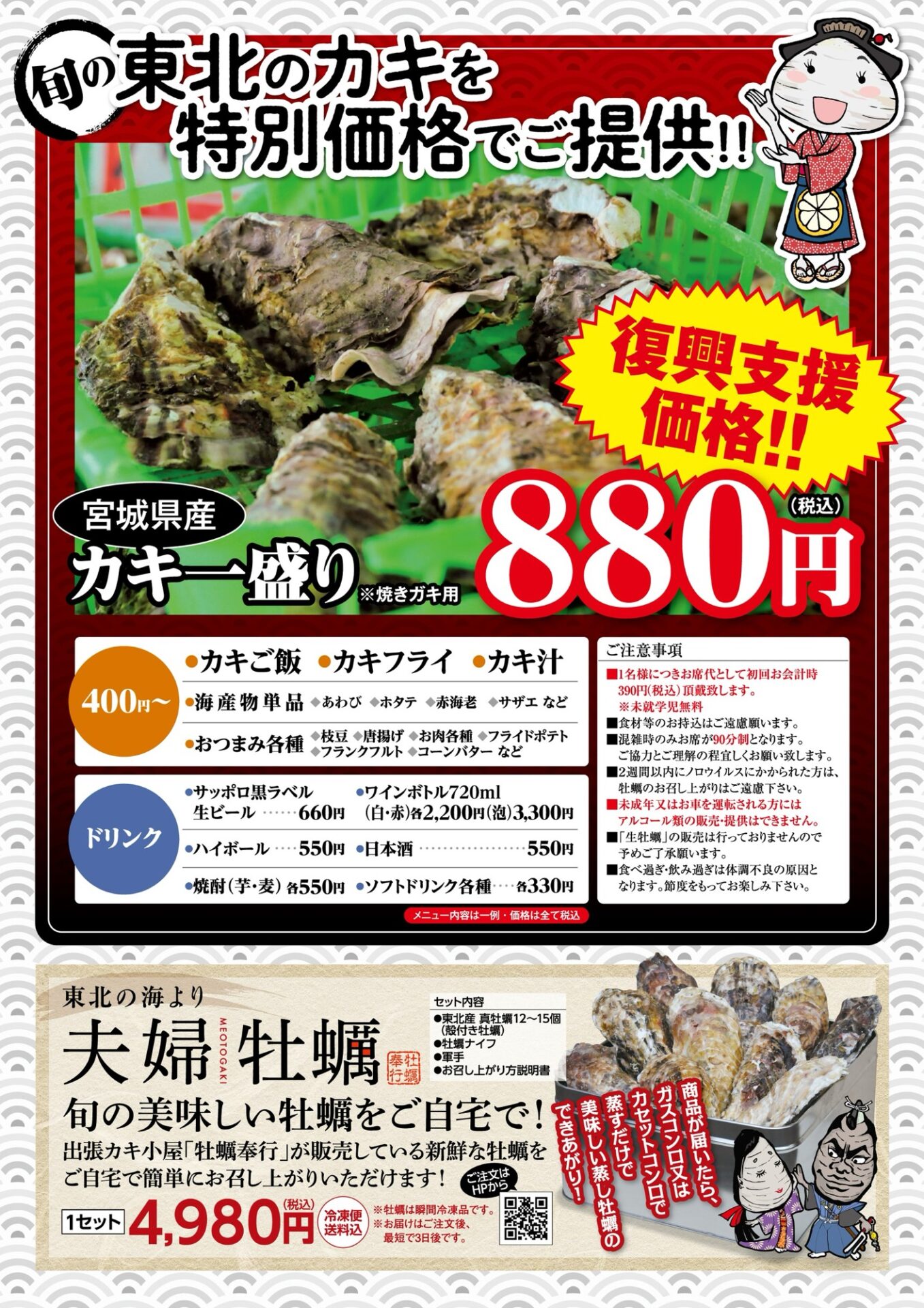 牡蠣だけでなく他の海鮮やおつまみ、ご飯なども提供され、食を通じて東北を応援する活動として人気を集めています。