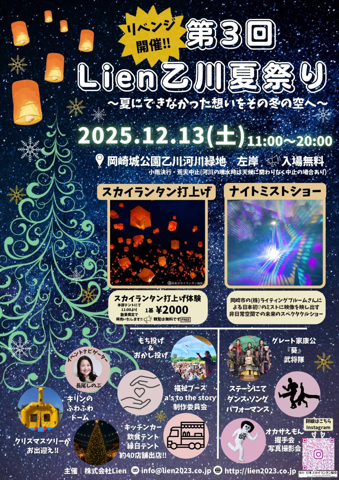台風による増水で中止になった「Lien乙川夏祭り」がリベンジを期して12月13日(土)11:00~20:00に開催されます。