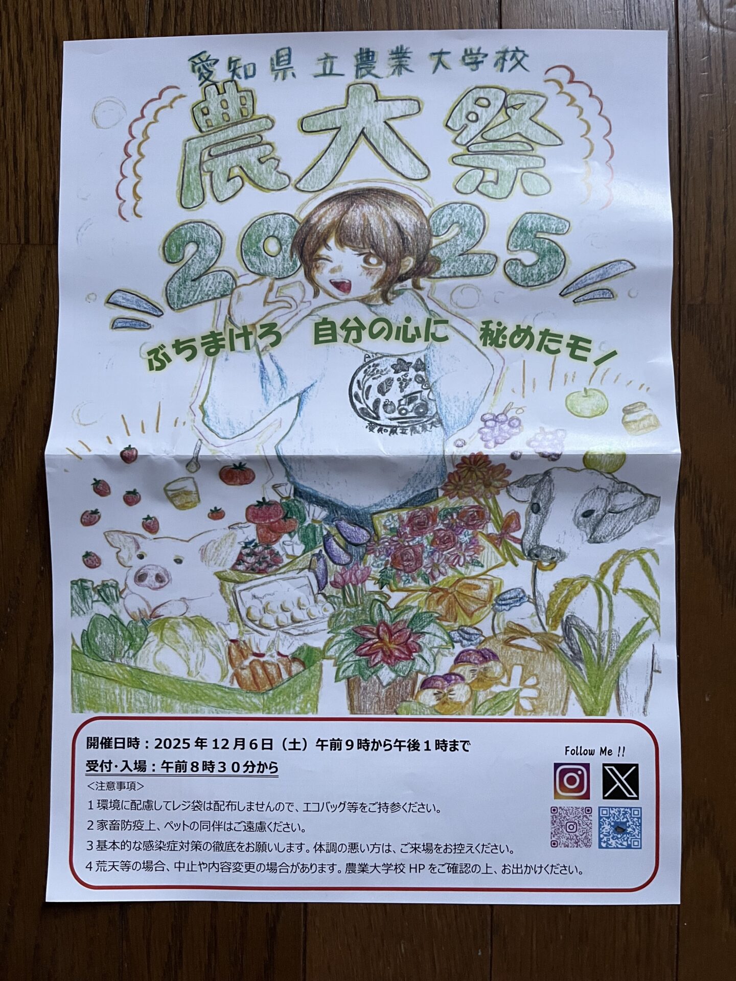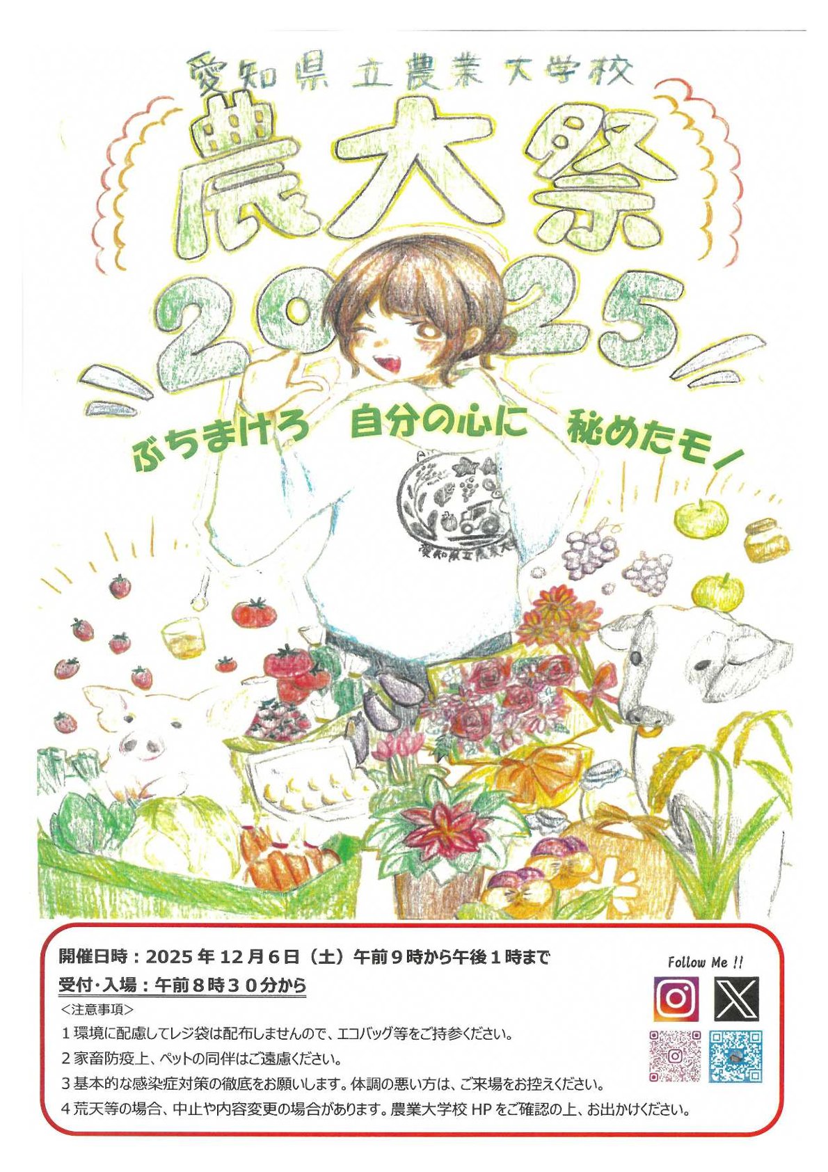 愛知県立農業大学校が愛知県の農業の魅力を発信することを目的に「農大祭2025」を12月6日(土)午前9時から午後1時(受付・入場は8時30分から)に開催します。