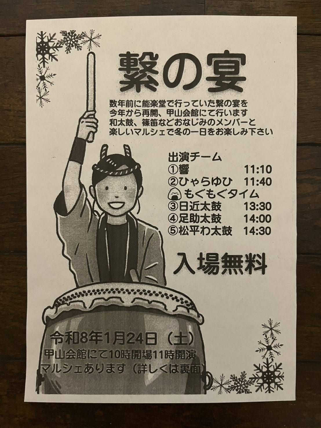 今回は甲山会館を会場に、和太鼓や篠笛など迫力ある演奏と、楽しいマルシェが一緒に楽しめるイベントになっています。