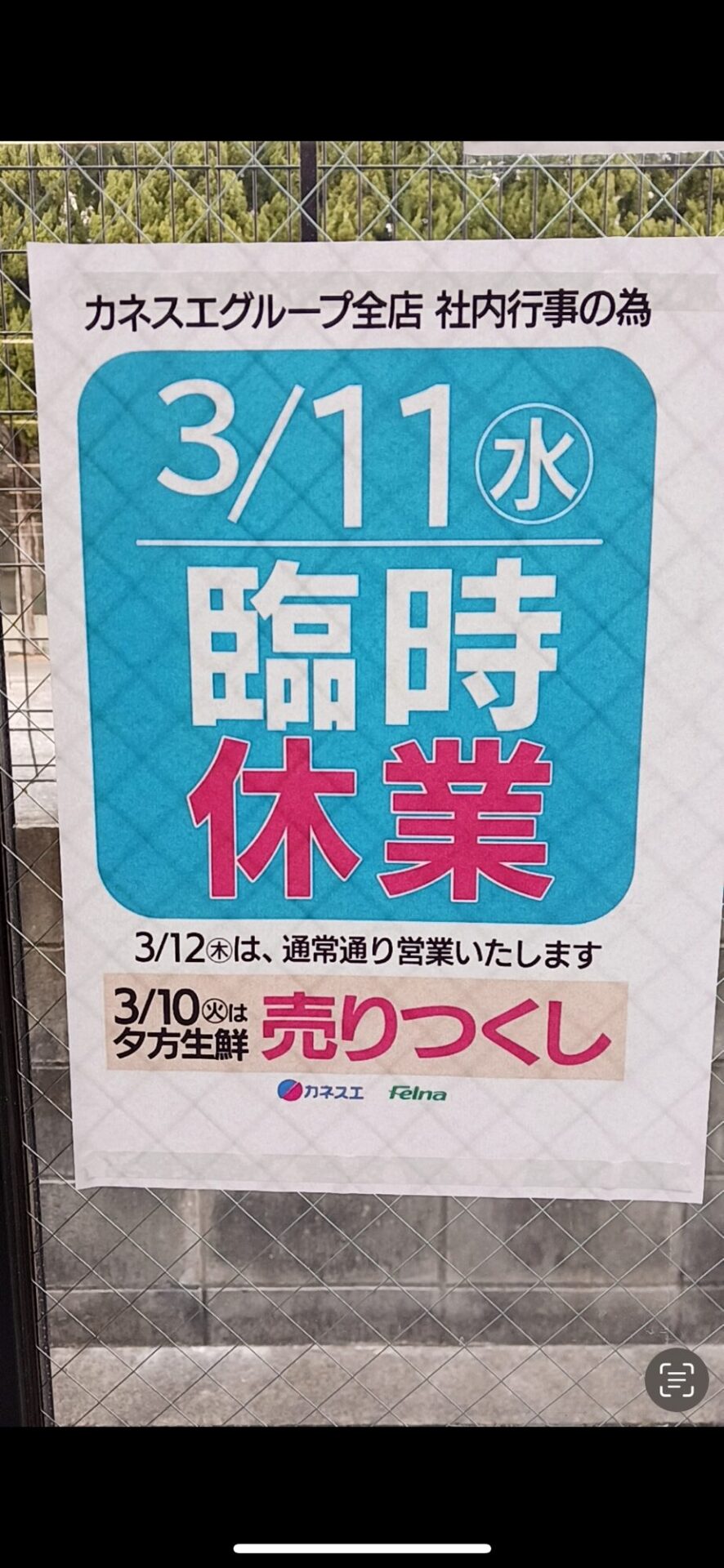 3月11日(水)カネスエ・フェルナが全店休業を発表されました^ ^