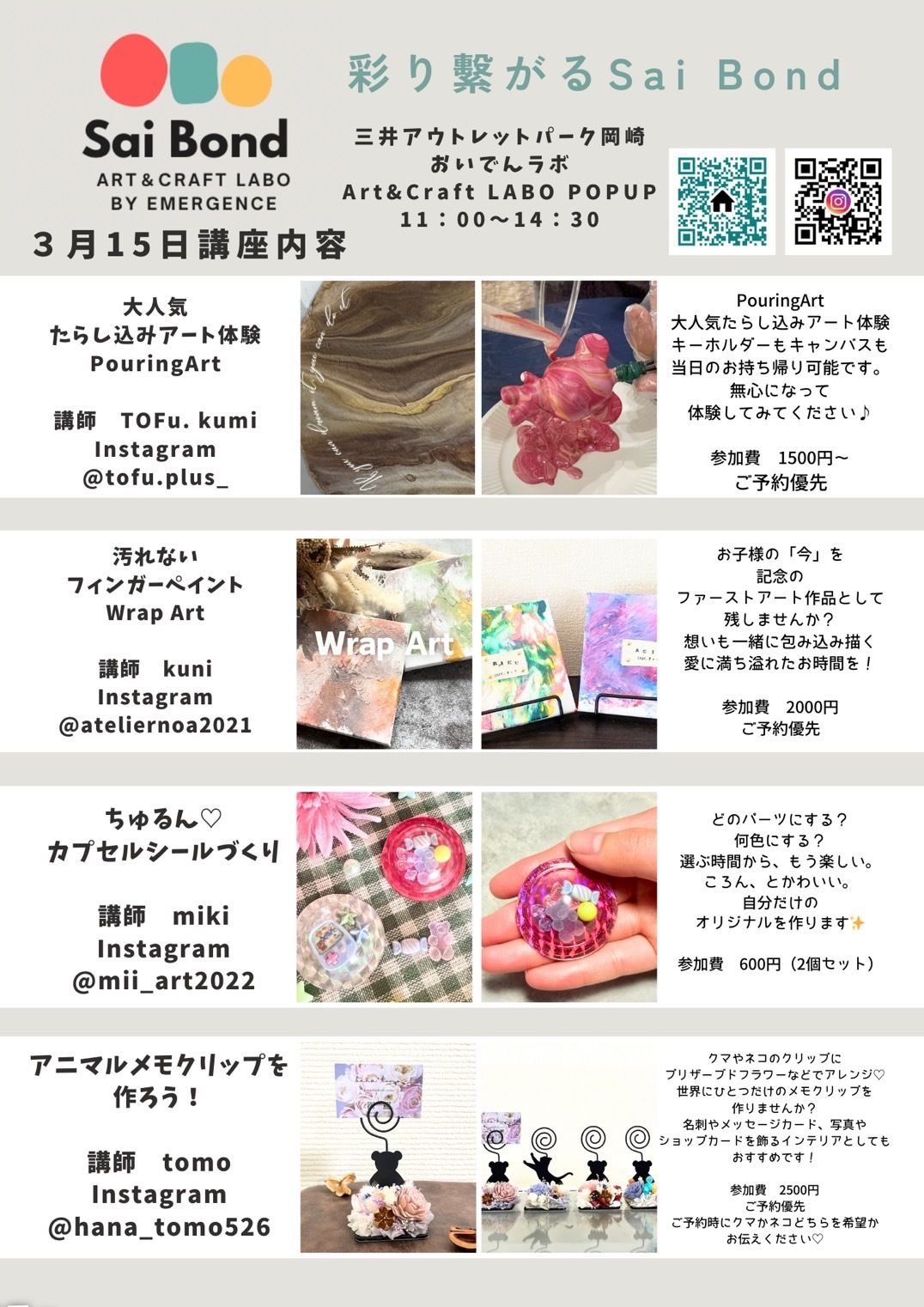 三井アウトレットパーク岡崎で、アートやものづくりを楽しめるワークショップイベント「Sai Bond ART & CRAFT LABO」が3月15日(日)に開催されます!